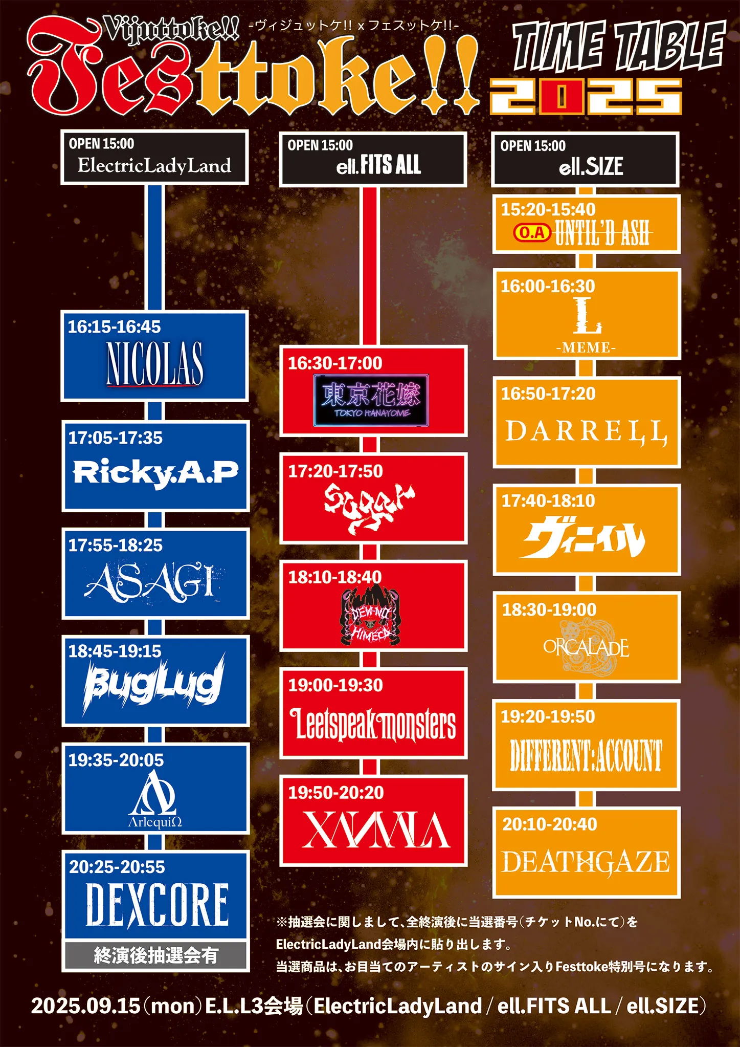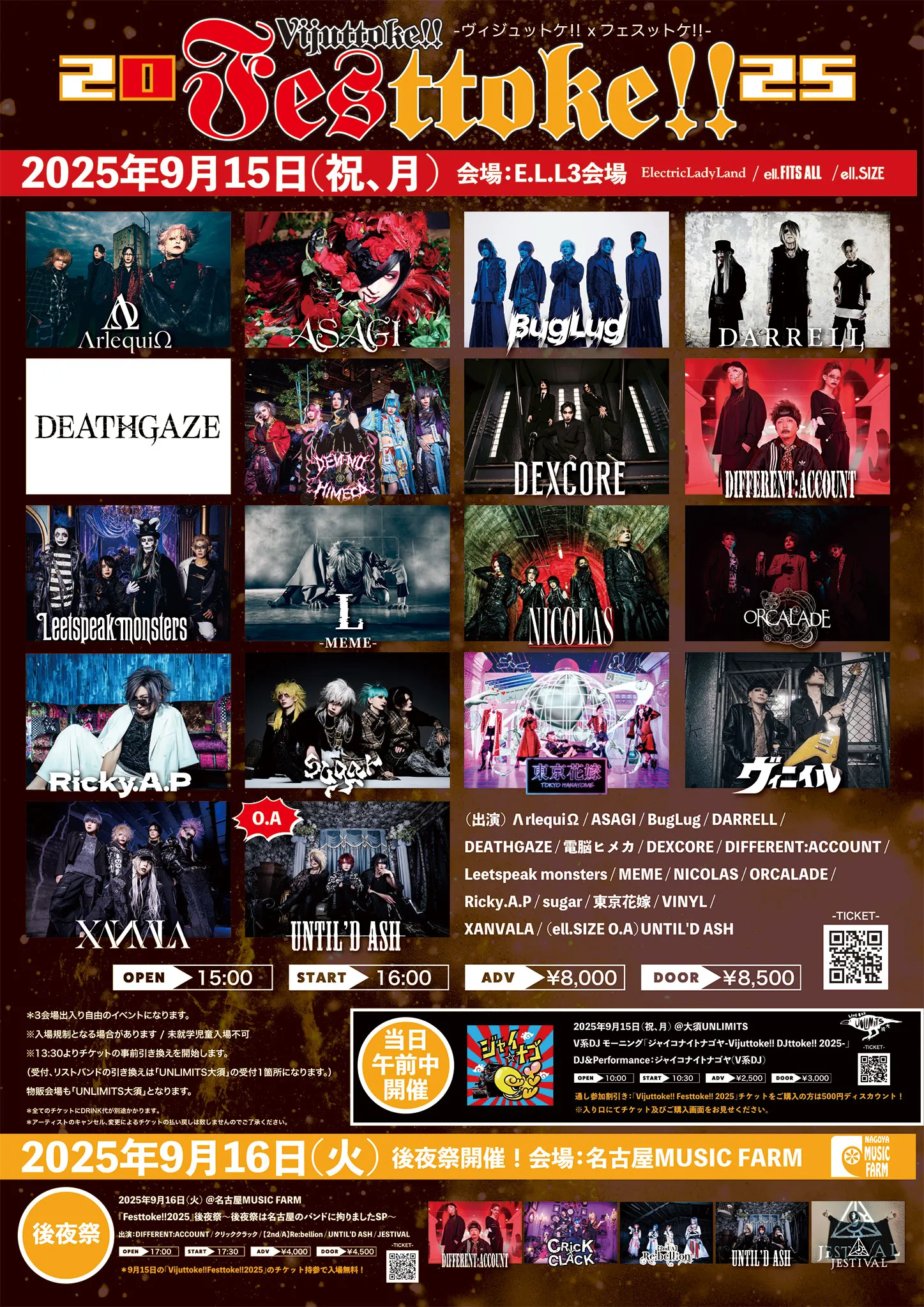 ## **[Vijuttoke!!Festtoke!!2025特設ページ](http://vijuttoke.com/contents/?page_id=42653)** *● 名古屋E.L.L3会場(ElectricLadyLand / ell.FITS ALL / ell.SIZE)* ● \[最終発表]DEATHGAZE / Ricky.A.P ● \[第三弾発表]sugar / 東京花嫁 / VINYL / (ell.SIZE O.A)UNTIL’D ASH ● \[第二弾発表]ASAGI / DARRELL / 電脳ヒメカ / DIFFERENT:ACCOUNT / Leetspeak monsters / MEME / ORCALADE / XANVALA ● \[第一弾発表]ΛrlequiΩ / BugLug / DEXCORE / NICOLAS \----- **■ \[OPEN / START]** 15:00 / 16:00 ■ **\[ADV / DAY]** ¥8,000 (D別) / ¥8,500 ※入場時別途ドリンク代必要 ■ **\[公演問い合わせ先]** ElectricLadyLand:052-201-5004 \----- ## **チケット情報** ■ **ぴあ一般発売日2025年8月10日(日) 10:00~** 決済方法:クレジットカード、セブン-イレブン、ファミリーマート引取方法:セブン-イレブン、ファミリーマート ■ 購入URL: \----- ## 特記事項 ■ 3会場出入り自由のイベントになります。 ■ 入場規制となる場合があります / 未就学児童入場不可 ■ 13:30よりチケットの事前引き換えを開始します。 (受付、リストバンドの引き換えは「UNLIMITS大須」の受付1箇所になります。) \----- ## 受付、リストバンド引き換え、物販 (会場)UNLIMITS大須 〒460-0011 名古屋市中区大須2-23-34 大須GATEビル1F [http://www.unlimits-osu.jp](http://www.unlimits-osu.jp/)